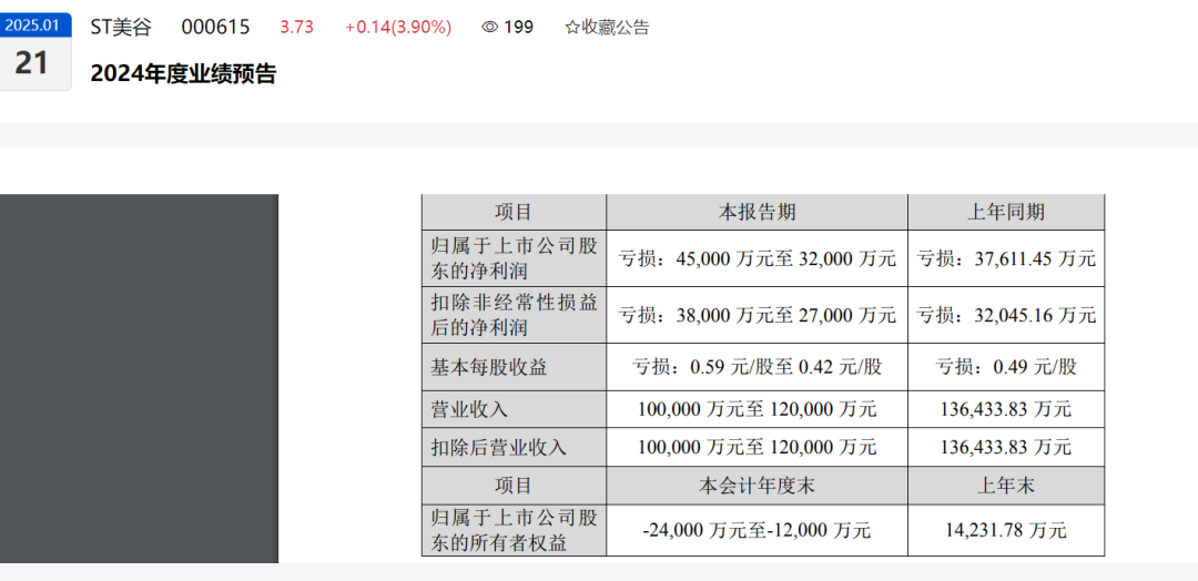 据ST美谷业绩预告,公司预计2024年亏损3.2亿元至4.5亿元。截至2024年底,公司归属于上市公司股东的所有者权益预计为-1.2亿元至-2.4亿元。
