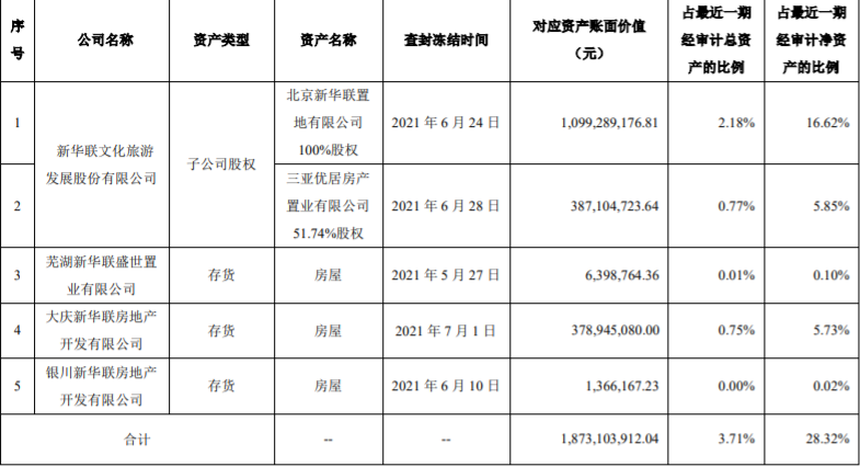 公告显示,新华联文化旅游发展股份有限公司及子公司芜湖新华联盛世置业有限公司、大庆新华联房地产开发有限公司、银川新华联房地产开发有限公司共被冻结查封资产1,873,103,912.04元,占最近一期经审计总资产的3.71%,占最近一期经审计净资产28.32%。具体如下: