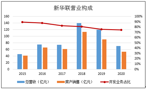 A股上市公司新华联文旅发展股份有限公司是新华联集团旗下聚焦在房地产开发的平台,业务始于1992年,但是直到2020年销售额仍仅有71.19亿,共计开发楼盘仅100个,都未能进百亿规模。