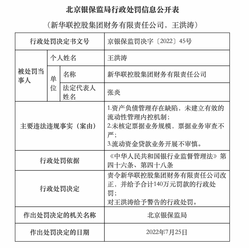 7月29日,北京银保监局公布行政处罚信息,新华联控股集团财务有限责任公司(下称“新华联财务”)被责令改正,并被罚款合计140万元;对法人王洪涛给予警告。