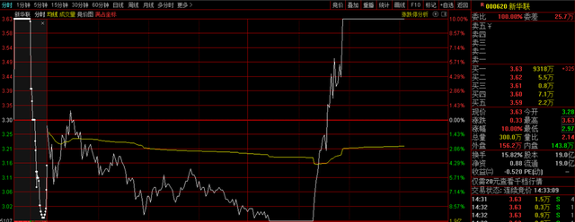 9月19日,3连板个股新华联低开低走,午后跌停,不过,在跌停板停留不到半个小时即有资金撬板,其后,不到20分钟新华联被资金拉涨停,成功上演地天板。截止发稿时,新华联报于3.6元,总市值68.8亿。