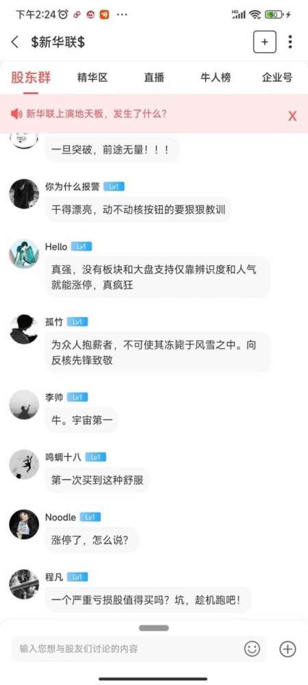 在尺度新华联股东群,有投资者表示,一个严重亏损股为何走的如此强?是坑吧。有投资者表示,现在的行情动不动核按钮,总有资金会站出来反核,新华联就是反核先锋。还有投资者表示,没有板块和大盘支持仅靠辨识度和人气涨停的,这是真强。