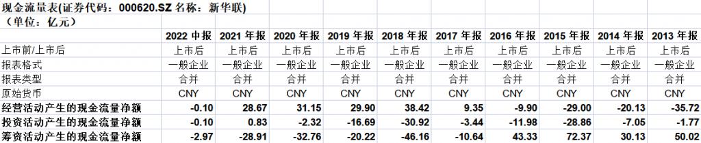而在连续亏损的同时,新华联的现金流方面也出现了不寻常的状况。根据该公司 2022 中报数据,其经营活动、投资活动、筹资活动现金流净值同时为负,这在该公司近十年的财报中还是首次出现。
