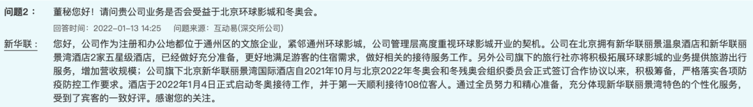 这还要回溯至2022年1月13日,彼时新华联曾在投资者互动平台公开表示,“公司作为注册和办公地都位于通州区的文旅企业,紧邻通州环球影城,公司管理层高度重视环球影城开业的契机”。
