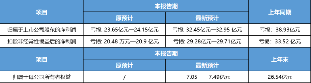 修正后业绩预告与此前公布的相比,亏损额增加不少。其中,新预计归属于上市公司股东净利润亏损高达32.45亿元-32.95亿元,扣除非经常性损益后净利润亏损29.28亿元-29.71亿元。与上年同期相比,亏损收窄并不明显。而额外增加的净资产一栏更是直接成了负数,触发了深交所的退市风险警示。
