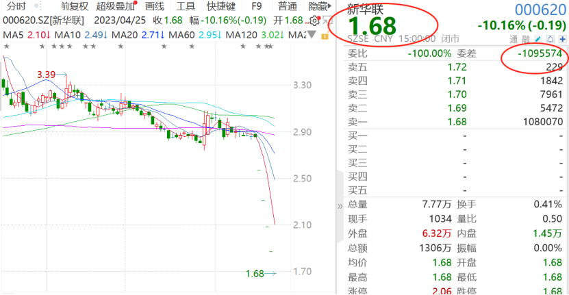 4月18日,新华联(000620.SZ)发布《2022年度业绩预告修正》公告,捅破了净资产为负的窗户纸。之后,股价连续遭遇6个跌停板。截至4月25日,报收1.68元/股,且跌停板上有近110万手卖单正在排队,急于冲出“围城”。