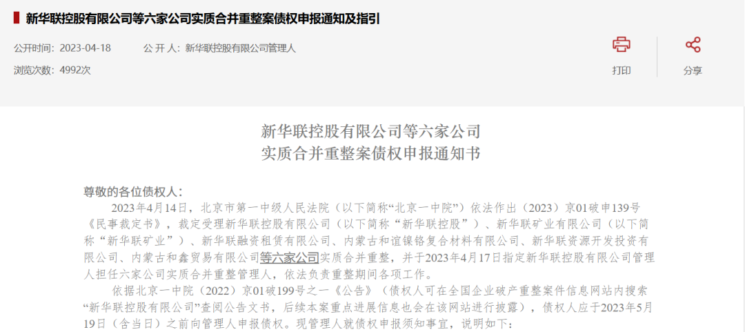 2022年8月9日,北京市第一中级人民法院裁定受理新华联控股进入司法重整。2023年4月14日,北京市一中院裁定新华联控股与新华联矿业等六家企业实质合并重整。