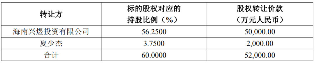 盈新发展以现金5.2亿元收购海南兴煜投资有限公司和夏少杰合计持有的长兴半导体60.00%股权,具体股权转让价款如下: