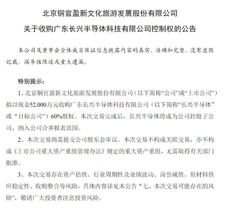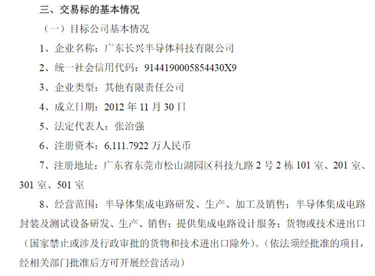 1月28日,盈新发展发布公告披露,公司拟以5.2亿元现金收购海南兴煜投资有限公司和夏少杰合计持有的广东长兴半导体科技有限公司(以下简称长兴半导体)60%股权。交易完成后,长兴半导体将成为盈新发展的控股子公司,并纳入合并报表范围。