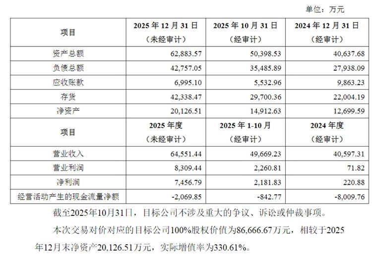 公告显示,此次交易对价对应的目标公司长兴半导体的100%股权价值为86,666.67万元,相较于2025年12月末净资产20,126.51万元,实际增值率为330.61%。2024年和2025年1-10月份,长兴半导体的经营活动产生的现金流量净额分别为-8009.76万元和-842.77万元。