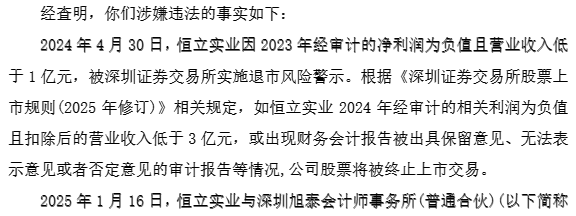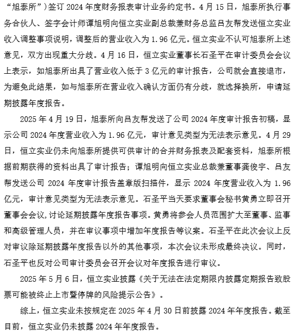 因为公司未按规定期限披露定期报告,*ST恒立在5月6日收到中国证监会《立案告知书》。此项调查已经结束。*ST恒立在6月17日收到了湖南证监局的《行政处罚事先告知书》,在告知书中描述的事实是*ST恒立对财报有做大业绩动机,对审计要求特别,旭泰会计所在审计中主动沟通但没得到认可。