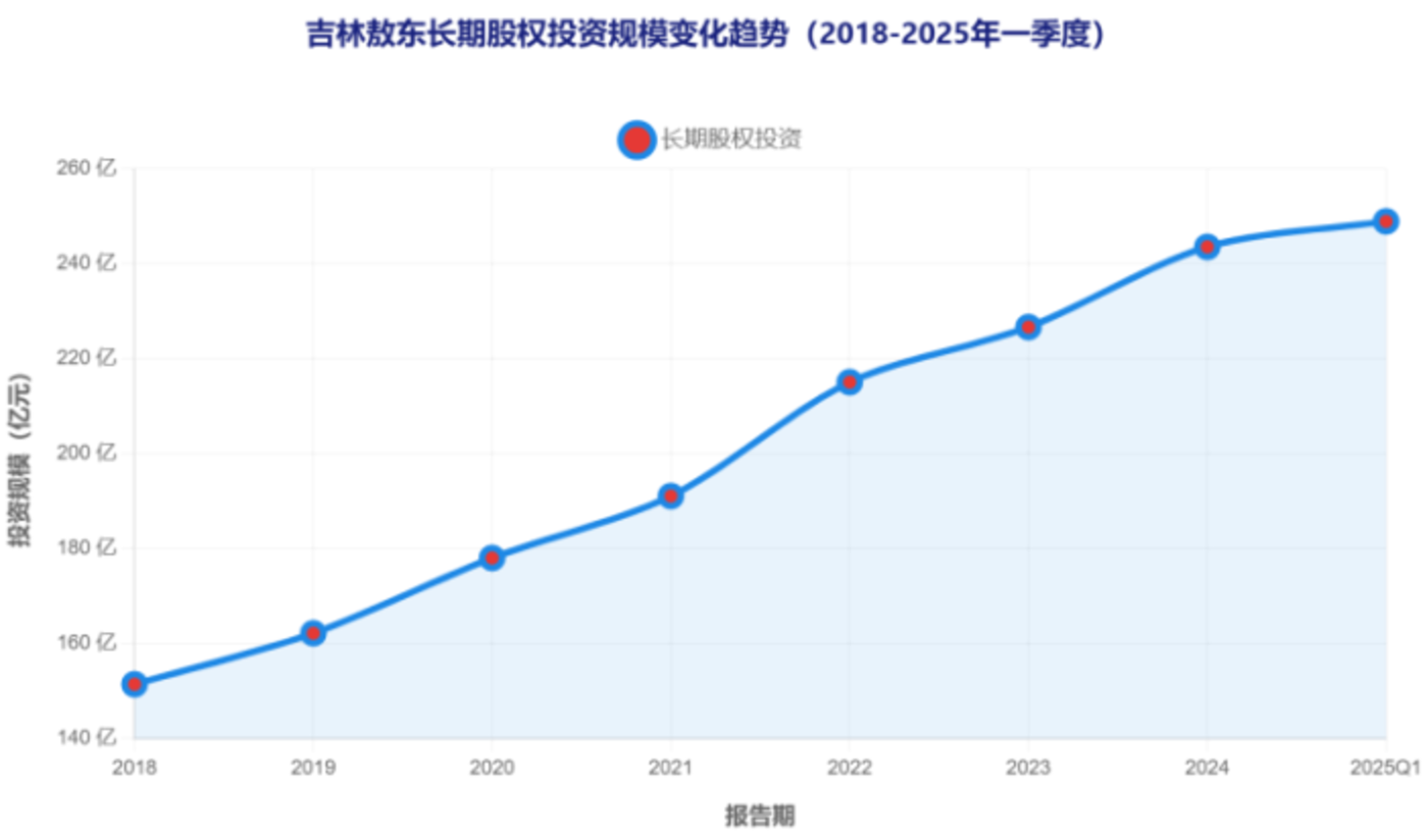 吉林敖东的资产结构呈现出一个稳定且日益突出的趋势——长期股权投资的核心化。据财报显示,吉林敖东的长期股权投资规模呈现持续、显著的扩张态势,从2018年的151.47亿元一路攀升至2025年第一季度末的248.89亿元。