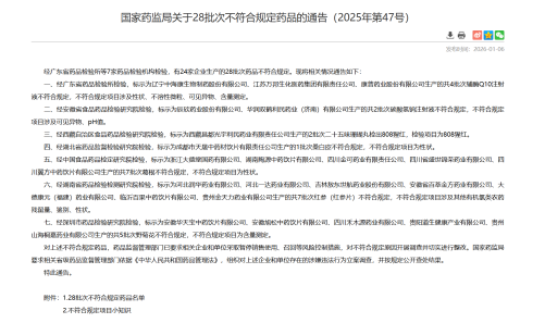 近日,国家药监局发布《关于28批次不符合规定药品的通告(2025年第47号)》。其中,标示为吉林敖东(000623.SZ)子公司吉林敖东世航药业股份有限公司(简称“敖东世航药业”)生产的红参(红参片)被通报不符合规定,不合格项目为“其他有机氯类农药残留量”
