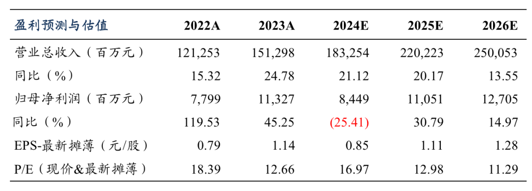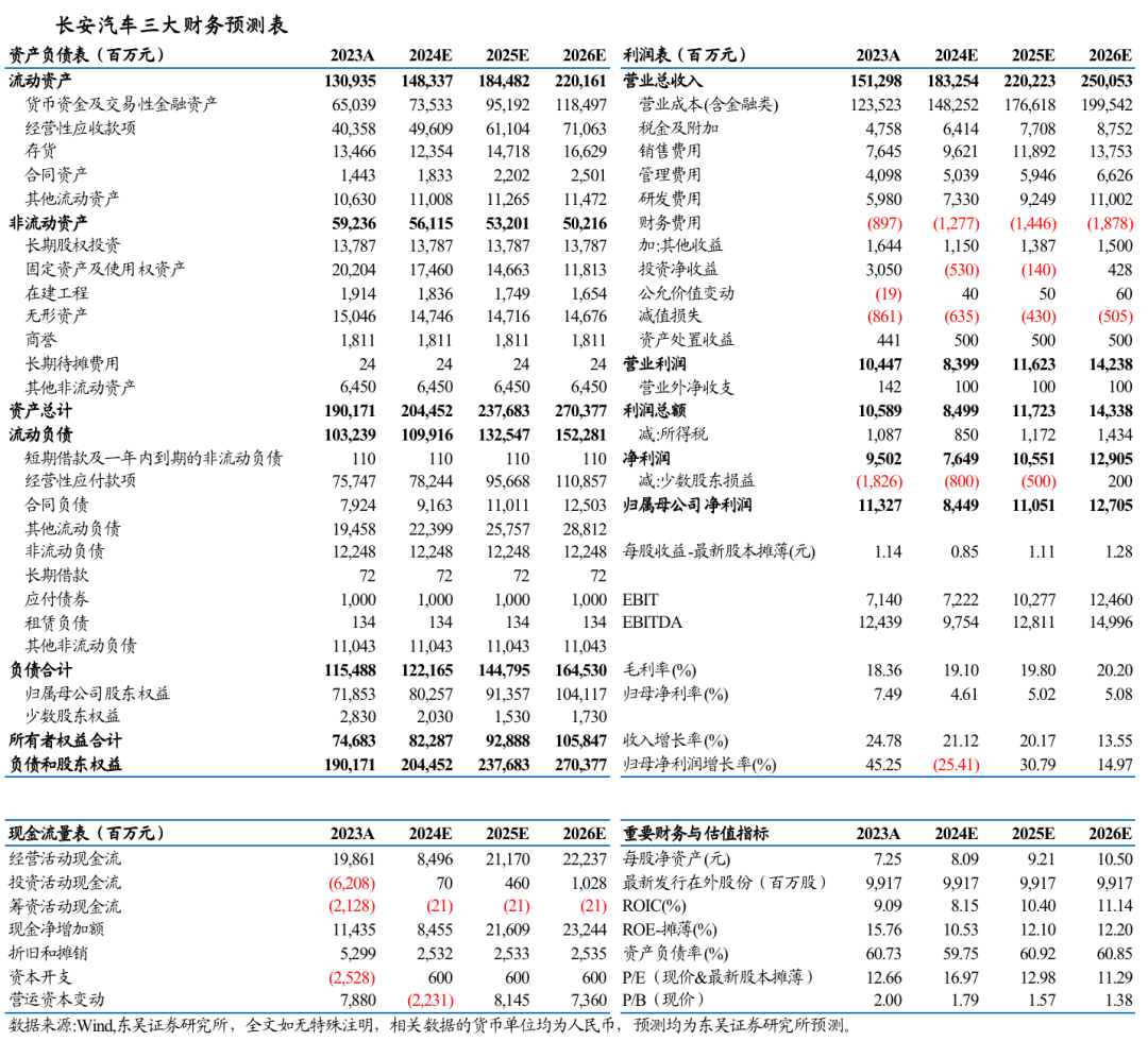 我们维持公司2024-2026年盈利预测,归母净利润为84/111/127亿元,分别同比-25%/+31%/+15%,对应EPS分别为0.85/1.11/1.28元,对应PE分别为17/13/11倍,维持长安汽车“买入”评级。