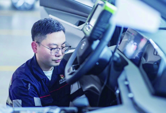 在合肥长安汽车有限公司(下称“合肥长安”)总装车间,一辆辆全新的CS75 PLUS混合动力汽车等待下线。CS75车型不仅在国内销售,还销到中东等海外市场。新车质量关系国内外用户的生命安全,安全检查至关重要。现场负责排除新车故障的工人随身携带两根锃亮的特制连杆,一位老工人对上海证券报记者说:“韩宏圆做的这个工装真方便。”韩宏圆,“90后”优秀党员,是合肥长安的汽车电器调试工,也是合肥长安的技能大师。