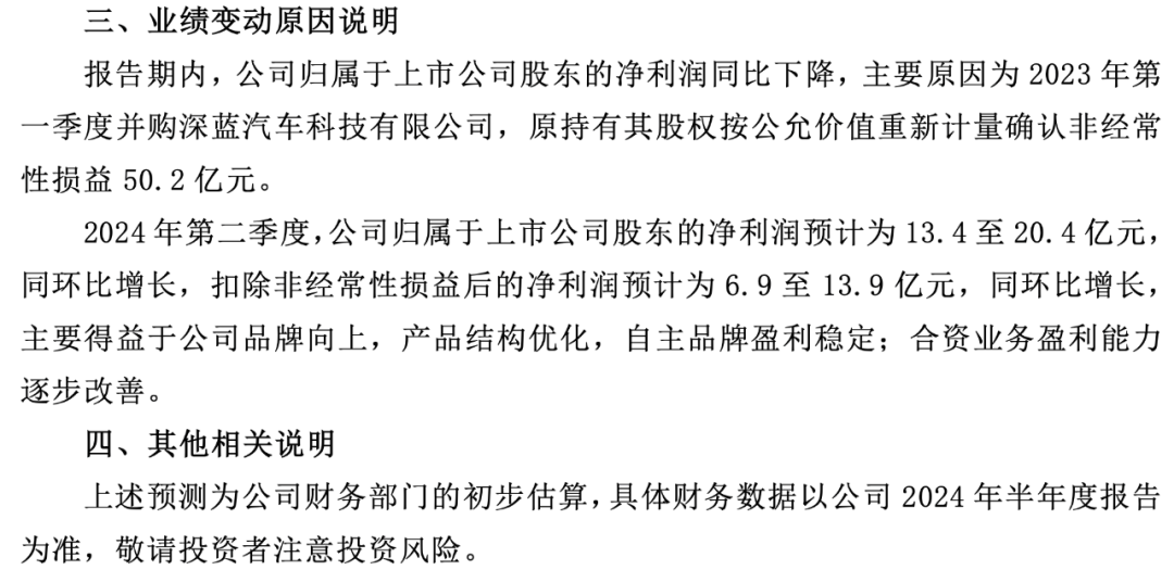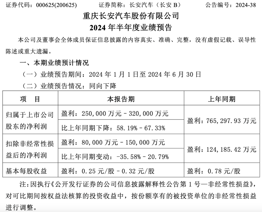 首先回到7月初,长安汽车发布的2024半年度业绩预告。