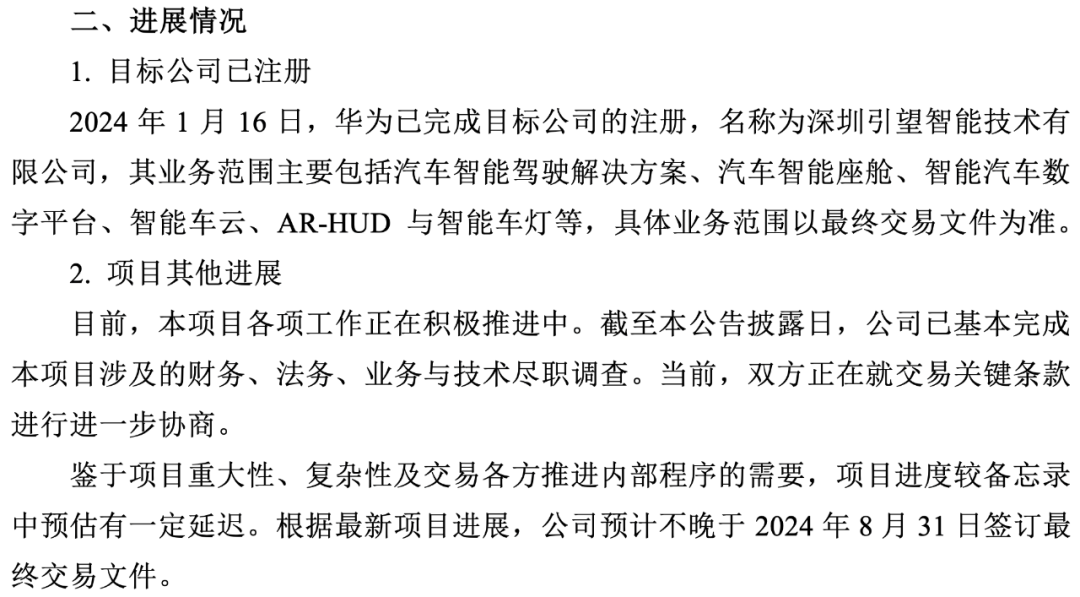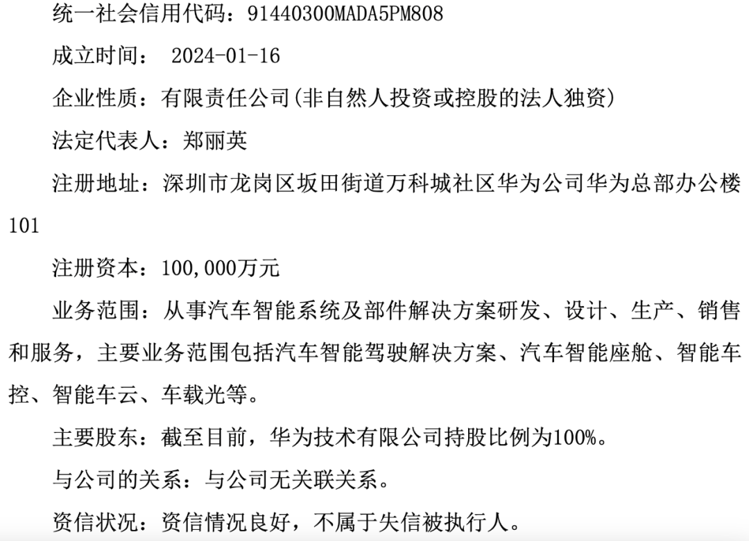公告中提及的深圳引望,正是之前长安汽车最早于2023年11月26日发布公告提及的,与华为合作,并由后者于今年1月成立的合资公司。