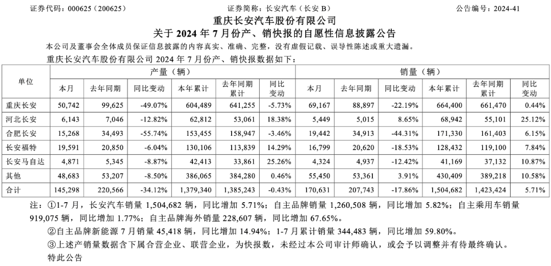 彼时长安汽车发布公告称,因天气炎热,当地高温限电导致停产。截至7月产销快报发布,长安汽车并未对同环比全面两位数下降的7月产销状况做出说明和解释。