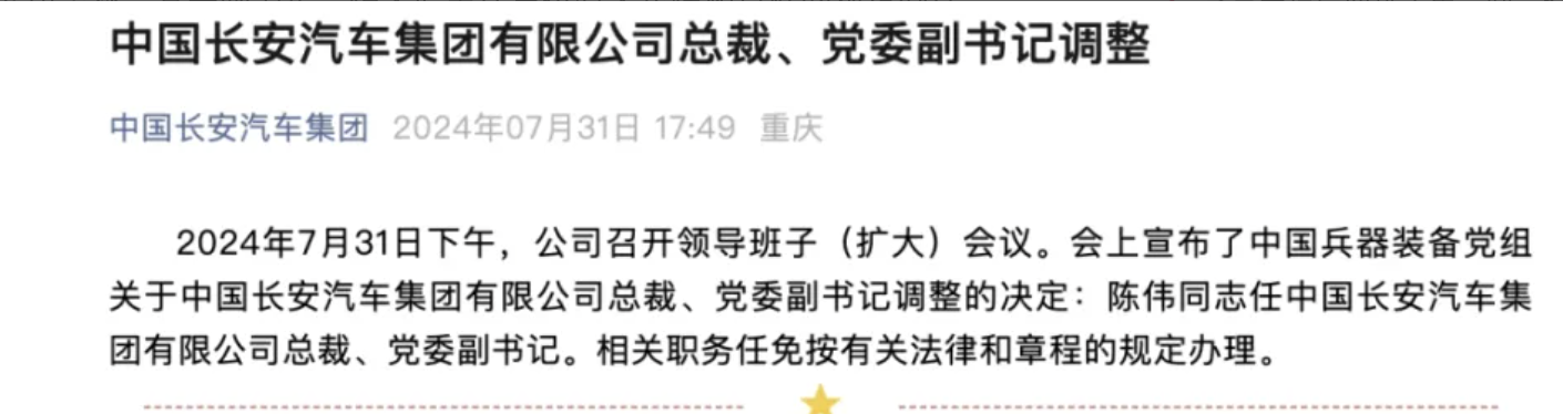 实际上,7月31日,中国长安汽车集团有限公司官宣主要领导调整的决定:陈伟同志任中国长安汽车集团有限公司总裁、党委副书记。