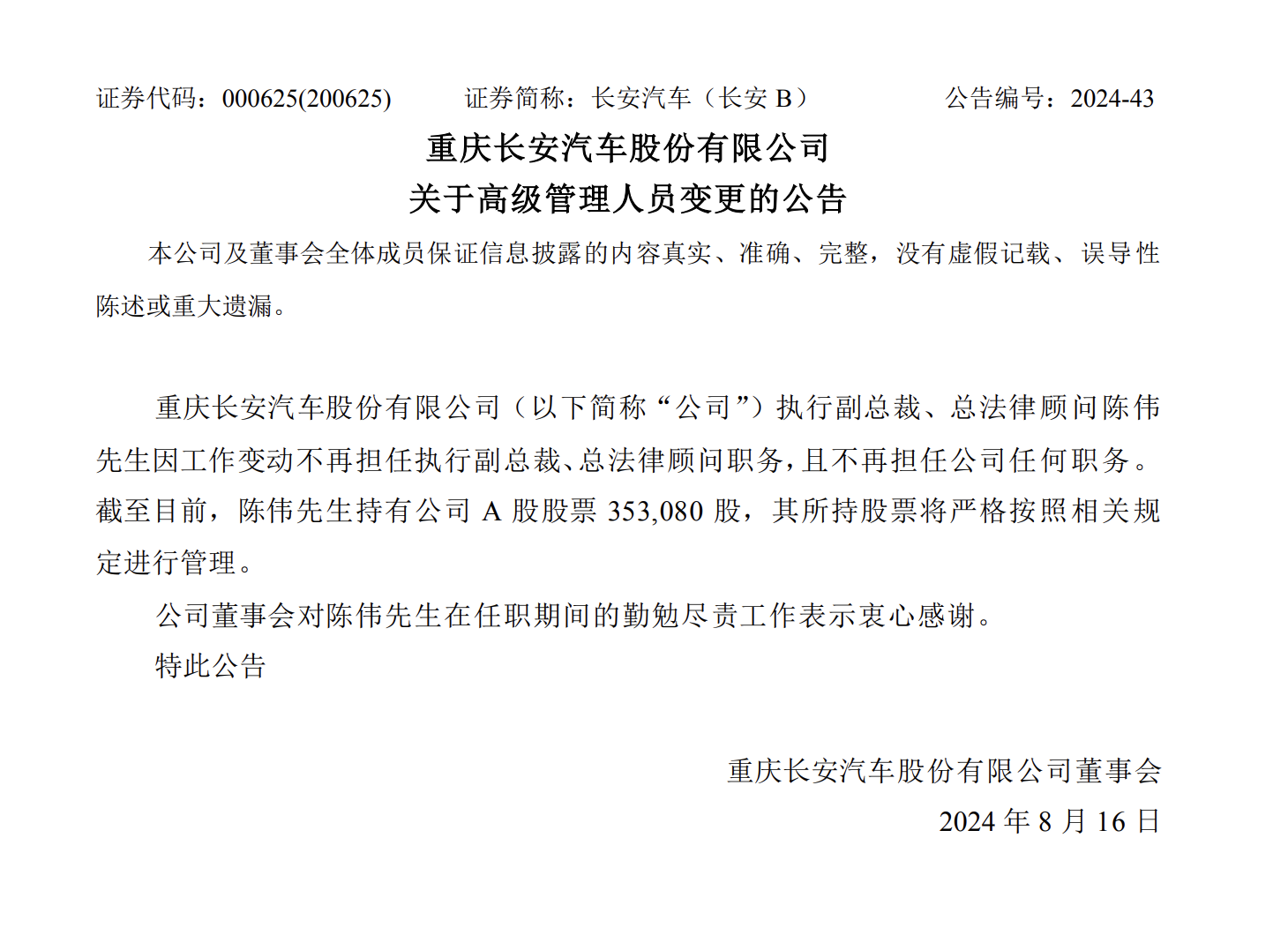 8月16日,重庆长安汽车股份有限公司(下称“长安汽车”)发布关于高级管理人员变更公告。公告内容显示,长安汽车执行副总裁、总法律顾问陈伟因工作变动不再担任执行副总裁、总法律顾问职务,且不再担任公司任何职务。