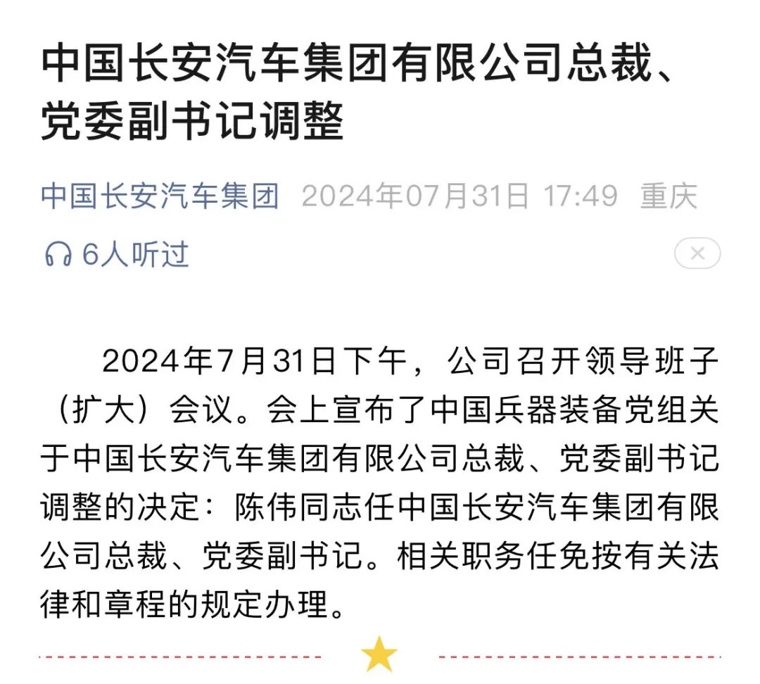 消息内容显示,2024年7月31日下午,公司召开领导班子(扩大)会议。会上宣布了中国兵器装备党组关于中国长安汽车集团有限公司总裁、党委副书记调整的决定:陈伟同志任中国长安汽车集团有限公司总裁、党委副书记。相关职务任免按有关法律和章程的规定办理。
