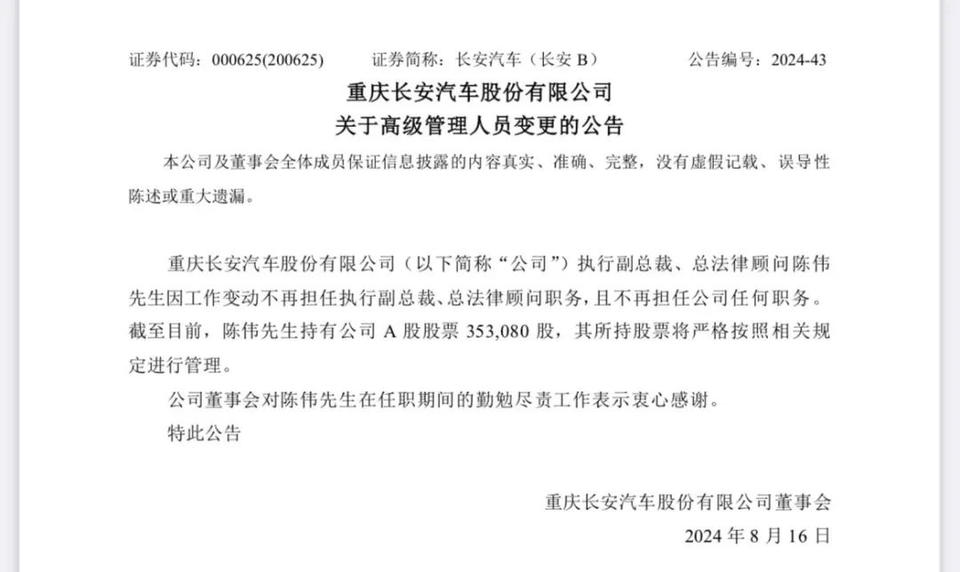 公告内容显示,重庆长安汽车股份有限公司执行副总裁、总法律顾问陈伟因工作变动不再担任执行副总裁、总法律顾问职务,且不再担任公司任何职务。