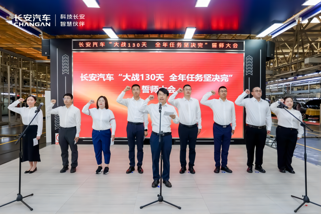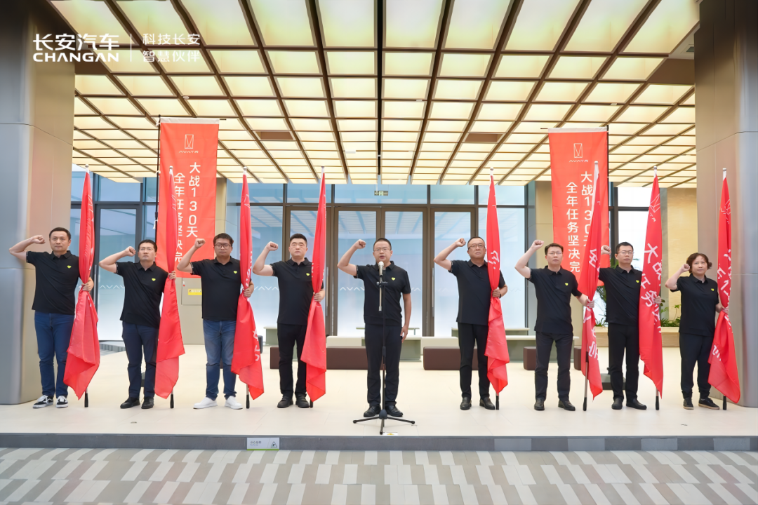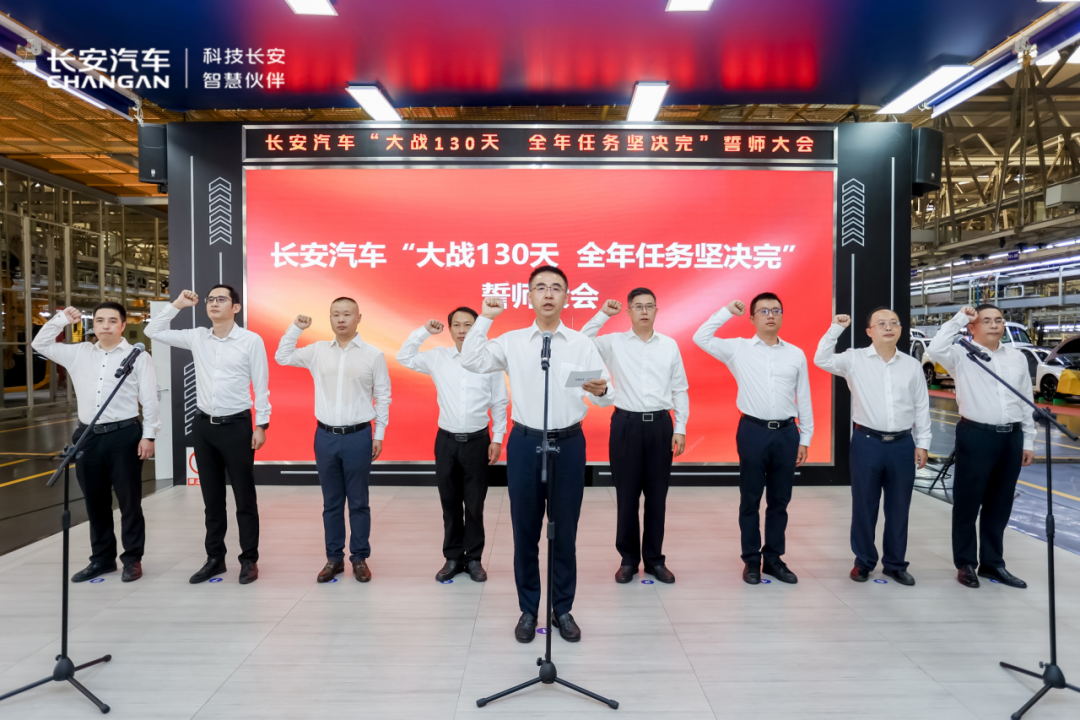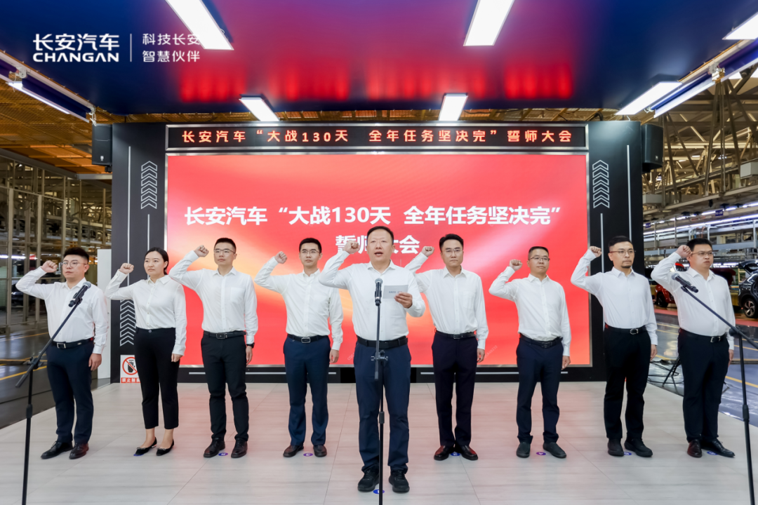 誓师大会上,阿维塔团队、深蓝汽车团队、长安启源+引力团队、长安轻型车+智慧营销团队、海外团队、合资团队和重点产品研发团队七大战队代表在公司领导的带领下,以激越昂扬的精神、有我必胜的信念、铿锵有劲的誓言,向决战130天的生产经营目标宣战。