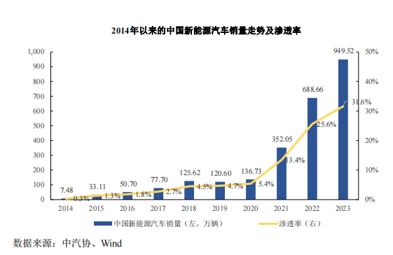 中国新能源汽车进入加速发展新阶段。公开数据显示,中国新能源汽车市场的渗透率从2014年的0.3%升至2023年的31.6%,2024年第三季度超过50%。
