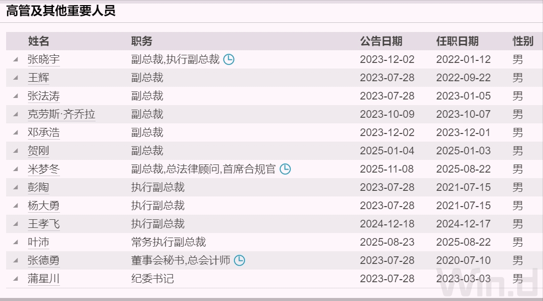 高管中还有副总裁王辉、张法涛、邓承浩、贺刚、米梦冬(兼任总法律顾问、首席合规官)、克劳斯·齐乔拉(德国);以及董秘兼总会计师(相当于财务总监)张德勇。