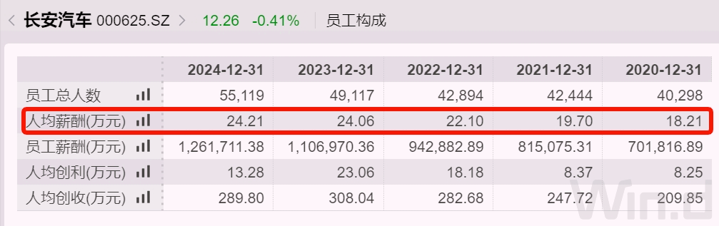 2024年,长安汽车人均创利13.3万元,人均税前薪酬24.2万元,是最近5年新高。