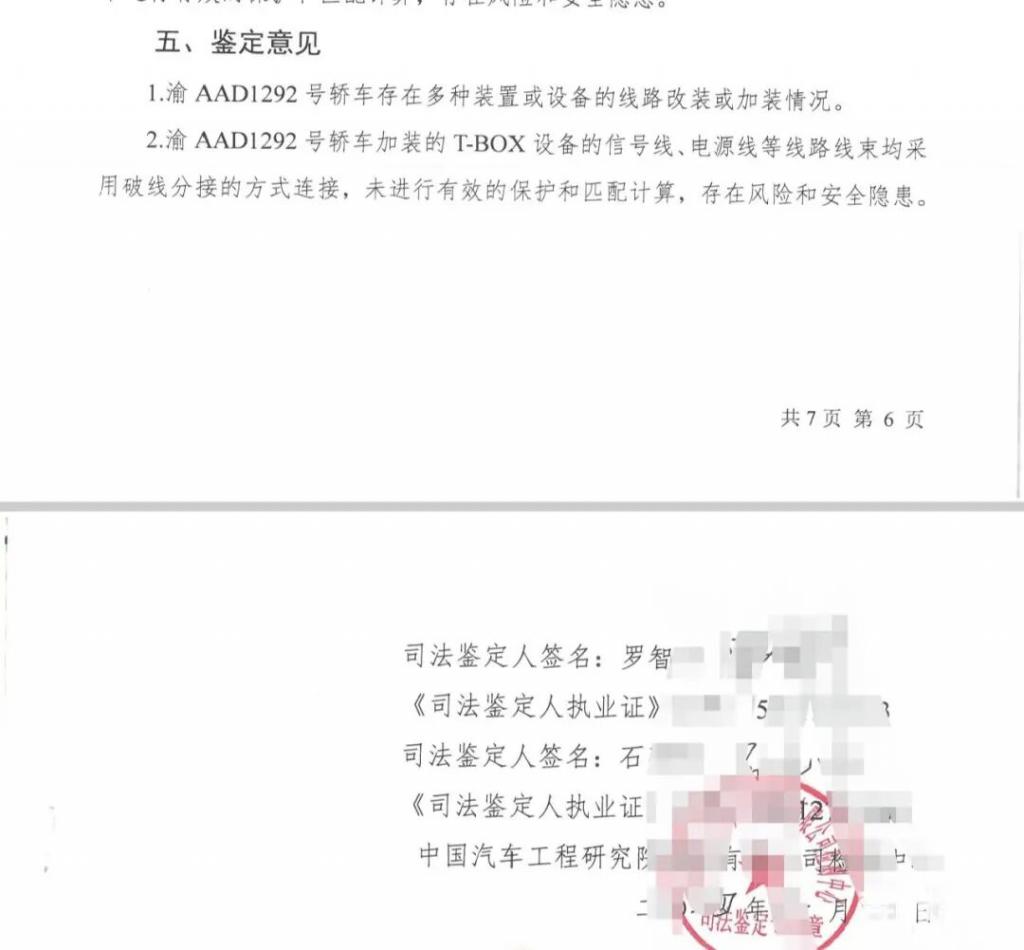 2024 年 10 月,微笑出行委托中国汽车工程研究院股份有限公司检测中心,对同批次其中一辆牌照为渝 AAD1292 的"长安逸动 EV460"车辆进行鉴定。该中心出具的《司法鉴定意见书》明确指出:"车辆存在多种装置或设备的线路改装或加装情况……加装的 T-BOX 设备的信号线、电源线均采用破线分接方式连接,未进行有效的保护和匹配计算,存在风险和安全隐患。"