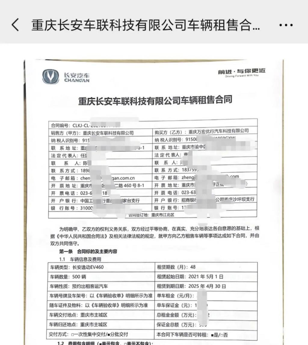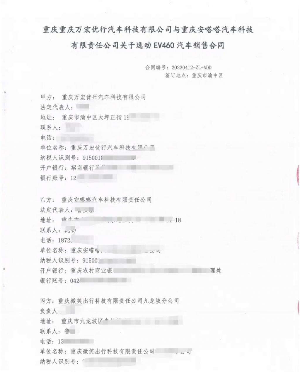 鲁先生介绍,2021 年,重庆长安车联科技有限公司(长安汽车全资子公司)将 500 台"长安逸动 EV460"车辆租售给重庆万宏优行汽车科技有限公司(以下简称万宏公司)。2023 年,万宏公司将其中 400 台出售给微笑出行。