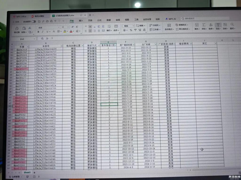鲁先生提供的一份《模组更换数据》统计显示,2021 年 7 月至 2025 年底,400 台"长安逸动 EV460"车辆中,有超过 100 台次因电池模组问题进厂维修,部分车辆甚至多次更换模组。维修周期最长的超过一个月。