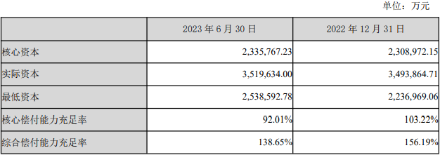 截至2023年6月30日,该公司综合偿付能力充足率为138.65%,上年末为156.19%;核心偿付能力充足率为92.01%,上年末为103.22%。