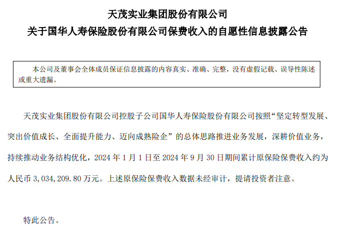 日前,天茂集团发布公告称,该公司控股子公司国华人寿2024 年 1 月 1 日至 2024 年 9 月 30 日期间累计原保险保费收入约为