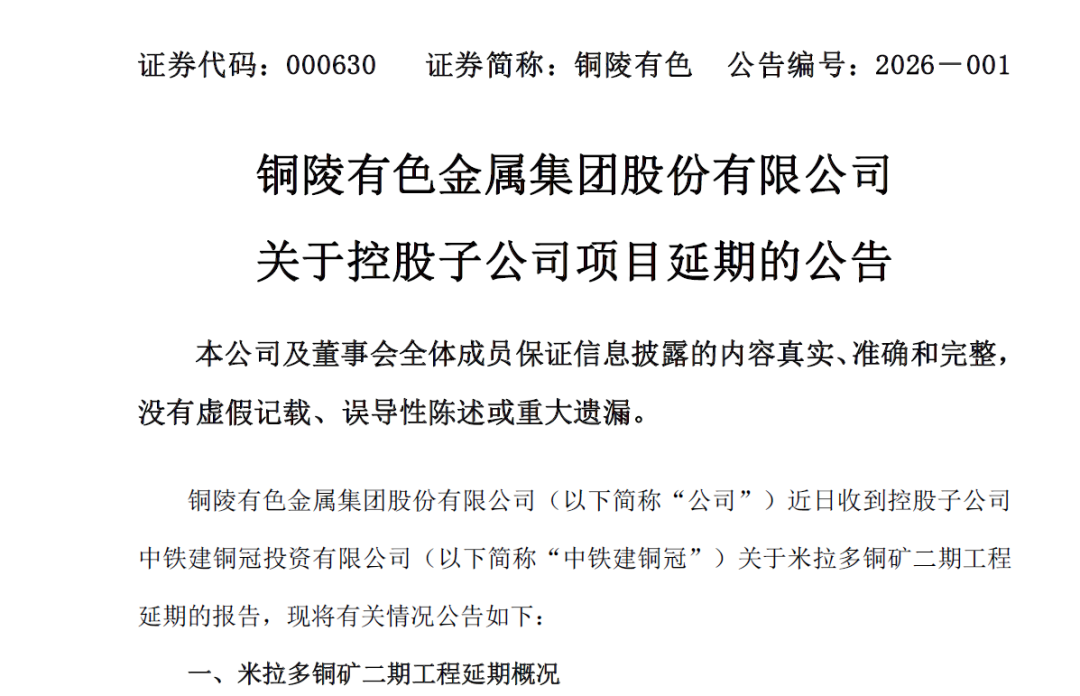 今日,铜陵有色发布的一则公告在业内激起涟漪。其控股子公司中铁建铜冠投资的米拉多铜矿二期工程因厄瓜多尔政治局势波动导致《采矿合同》签订延迟,正式投产时间变得不确定。这个原本计划在今年初投产的重大项目,突然被按下了暂停键。