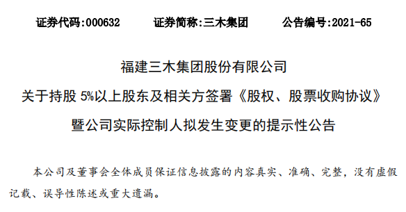 12月21日凌晨,福建三木集团官方发布一则公司实际控制人拟发生变更的提示性公告,宣布福州开发区国有资产营运有限公司将通过协议方式收购多方股权,取得三木集团控制权,福州经济技术开发区财政局将成为三木集团实际控制人。