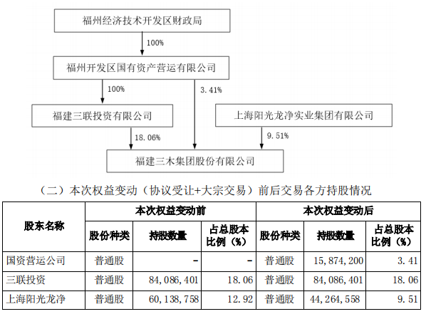 福州开发区国有资产营运有限公司将通过证券交易所的大宗交易方式收购上海阳光龙净实业集团有限公司持有的福建三木集团股份有限公司3.41%股份。