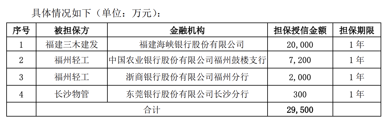 与全资子公司福建三木滨江建设发展有限公司分别为全资子公司福建三木建设发展有限公司向福建海峡银行股份有限公司申请20,000万元的授信额度提供担保;为控股子公司福州轻工进出口有限公司向中国农业银行股份有限公司福州鼓楼支行申请7,200万元的授信额度提供担保;为控股子公司福州轻工向浙商银行股份有限公司福州分行申请2,000万元的授信额度提供担保;全资子公司长沙三兆实业开发有限公司为控股子公司长沙黄兴南路步行商业街物业管理有限公司向东莞银行股份有限公司长沙分行申请300万元的授信额度提供担保。