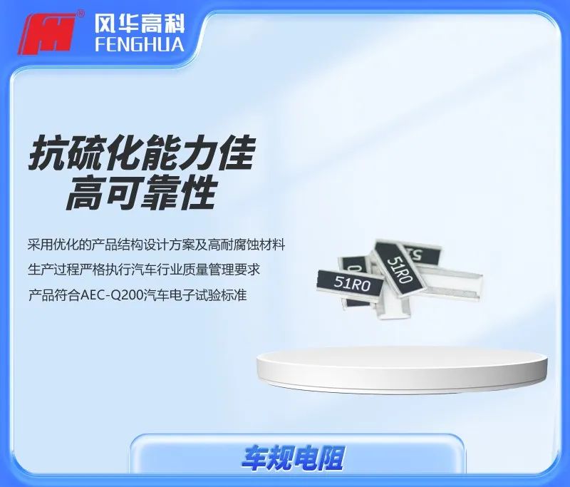 风华高科深耕电阻产品30年,自2016年推出首条车规产品生产线,目前公司车规系列电阻产品齐全,产品技术成熟稳定。公司车规电阻产品线从汽车电子客户产品设计前端导入,形成厚膜、合金、薄膜三大技术平台,高功率、抗浪涌列、超低阻系列等特殊应用车规电阻产品应运而生。其中抗硫化厚膜电阻产品选用优质的内电极材料及保护材料,结合独特的抗硫化技术,防硫化能力较常规品提升近10倍,能更好地适应恶劣的车辆使用环境。