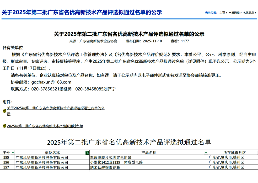近日,广东省高新技术企业协会发布关于2025年第二批广东省名优高新技术产品评选拟通过名单的公示,风华高科自主研发生产的“车规厚膜片式固定电阻器”“小型化1412及3225一体成型电感”和“纳米钛酸钡陶瓷粉”三款产品,凭借其卓越的技术创新水平和市场竞争力,荣获“2025年广东省名优高新技术产品”称号。