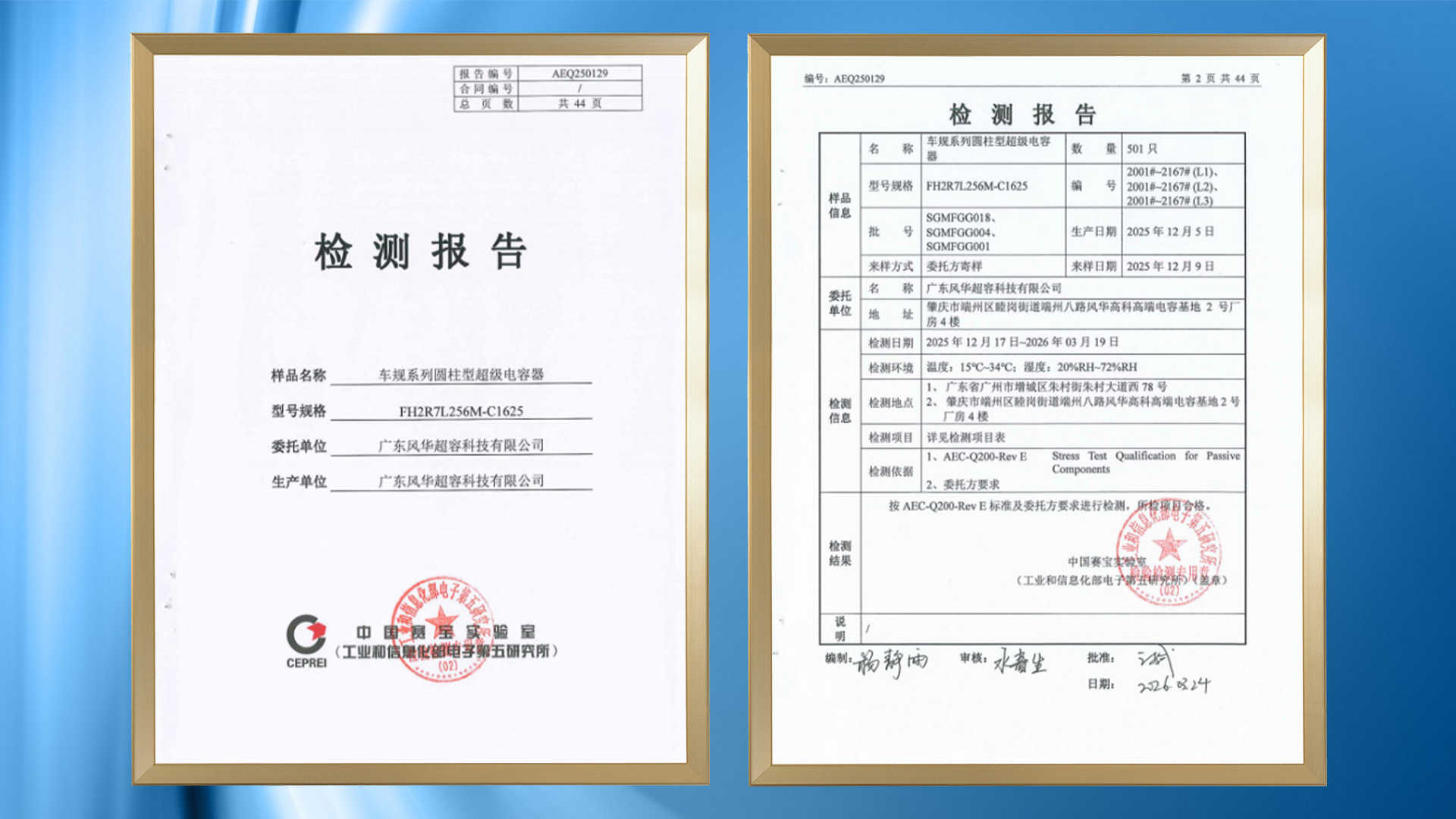 风华高科车规级超级电容器,已成功获得AEC-Q200 Rev E权威车规认证,全面满足汽车电子领域严苛准入标准与车载全周期可靠性要求,为跻身车规级被动元器件核心供应链,助力新能源汽车与智能网联汽车的电子系统安全稳定运行提供坚实保障。