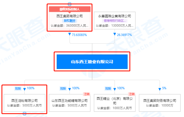 西王淀粉由山东西王糖业有限公司100%控股,此外西王糖业又由西王集团有限公司控股,这正是西王食品的控股股东。