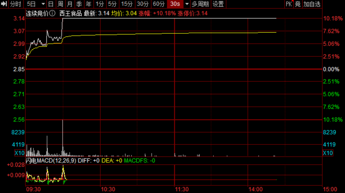 3月16日(公告发布后的首个交易日),西王食品股价迎来涨停,报3.14元/股,总市值33.89亿元。