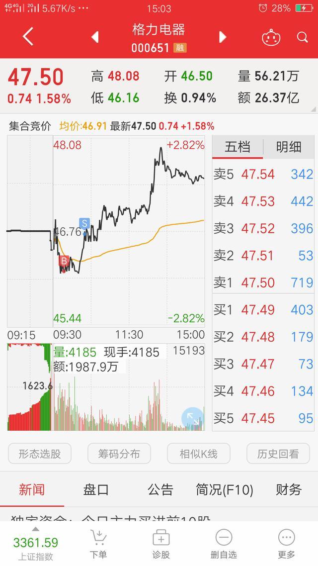 10点10分,股价突然从46.18元直线反弹,九分钟后至46.77元,彼时分别以46.76、46.73元T 出之前加仓部分,之后股价回落震荡。