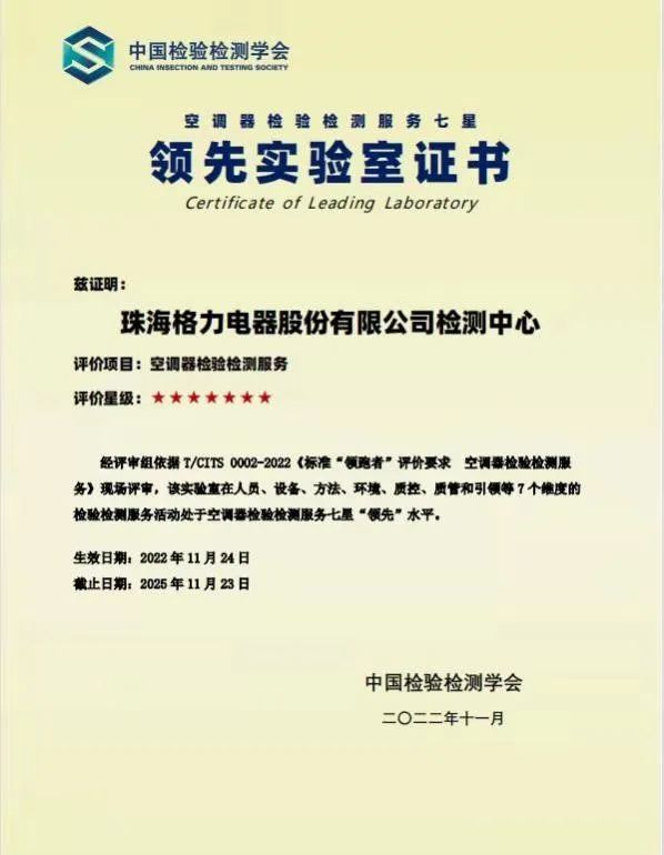 近日,由中国检验检测学会组织的“2022年电子电器检验检测“领先”实验室评选工作”活动落下帷幕,珠海格力电器股份有限公司(以下简称“格力电器”)荣获“空调器检验检测服务七星领先实验室”认证,成为全国首批达到最高七星水平的企业。
