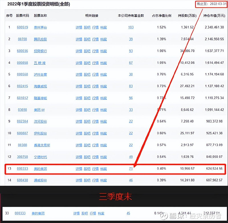 看见了吧,截至今年一季度末时,易方达基金虽然减持了美的集团,从其前十大持仓股票名单上消失了,但是,易方达旗下依然还有71只基金,合计持有了1亿多股的美的集团。可是,到了三季度末时,仅剩45只基金(指数基金被动配置居多)4311万股了,减持数量高达60%。美的集团在易方达基金的持仓金额排名,从前13名,落后到第33名,排队落后到海尔智家之后了。这也就是美的集团今年跌幅会不仅大于格力电器,也会大于海尔智家的重要原因之一。