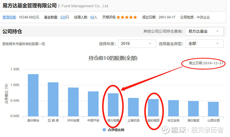 易方达基金公司与美的集团是近亲这事,不需要我再说了。过去,易方达基金持有的格力电器比美的集团还多,今天的股民,未必都知道。根据天天基金网上的统计数据,2019年末,易方达基金公司的前十大重仓股票中,格力电器列第五,美的集团随后排第七。