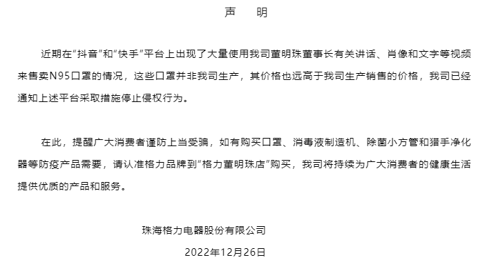 12月26日早间,格力电器在其官方微信号发布声明称,近期在“抖音”和“快手”平台上出现了大量使用格力电器董事长董明珠有关讲话、肖像和文字等视频来售卖N95口罩的情况,这些口罩并非格力生产,其价格也远高于格力生产销售的价格。