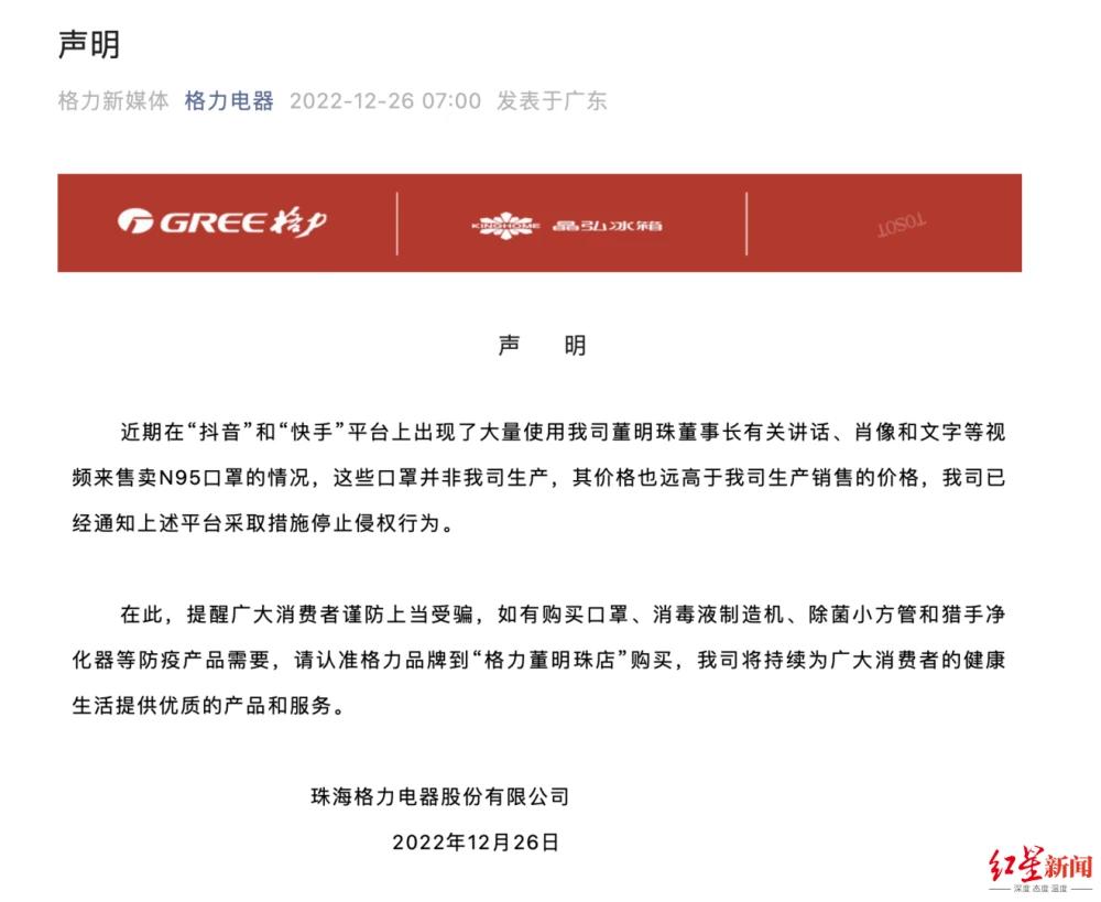 12月26日,红星资本局从官方微信公众号“格力电器”获悉,格力电器(000652.SZ)发布声明:“近期在抖音、快手平台上出现了大量使用我司董明珠董事长有关讲话、肖像和文字等视频来售卖N95口罩的情况,这些口罩并非我司生产,其价格也远高于我司生产销售的价格,我司已经通知上述平台采取措施停止侵权行为。”